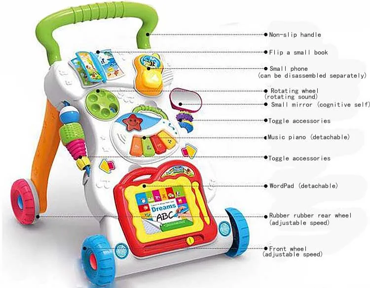Игрушки-каталки тренируют координацию движений и укрепляют мышцы малыша. Игровой центр на панели используется как развивающий элемент. Важно чтобы устройство имело фиксатор контроля скорости, чтобы ребенок не упал, толкая предмет.