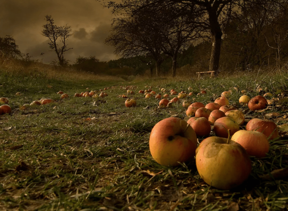 ein apfelzweig mit äpfeln darauf in einem obstgarten bei sonnenuntergang.
