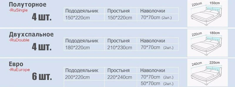 Наволочки: 50х70 (см.) (2 шт.) 70х70(см.) (2 шт.) Простынь: 220х240(см.) Пододеяльник: 215х145 (см.) (2 шт.)